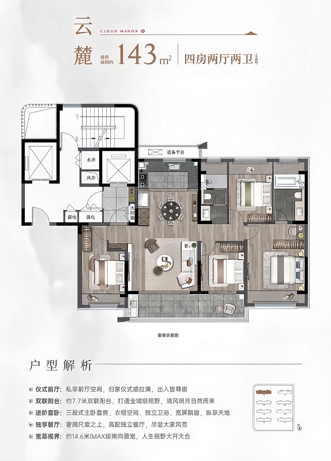 【布局】 四开间朝南,约7.7m双联阳台,约14.6mIMAX南向面宽
