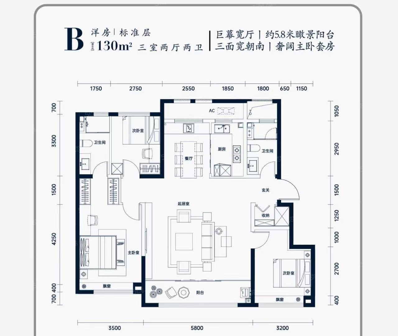 【布局】 巨幕宽厅,5.8米瞰景阳台,三面朝南,奢侈主卧套